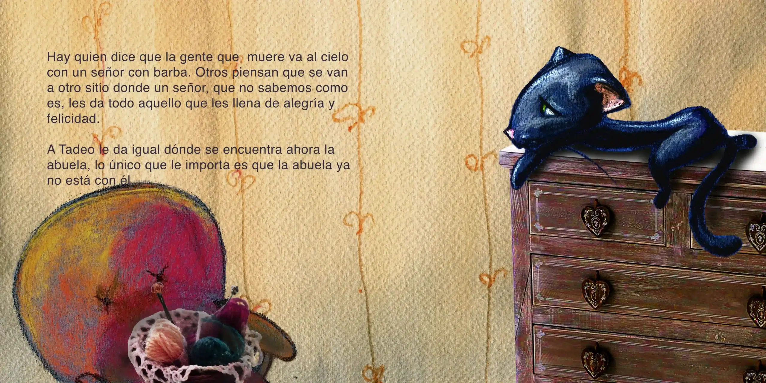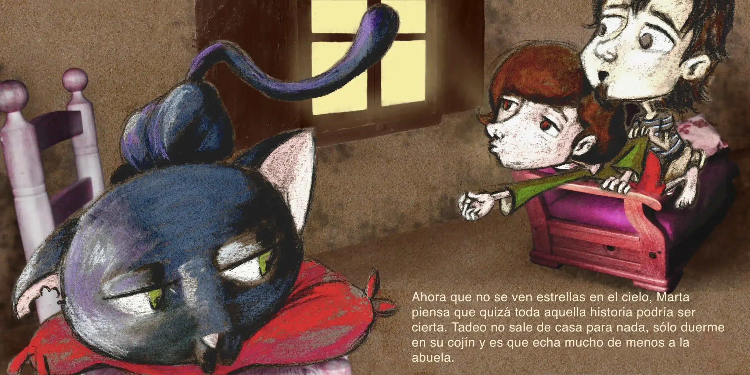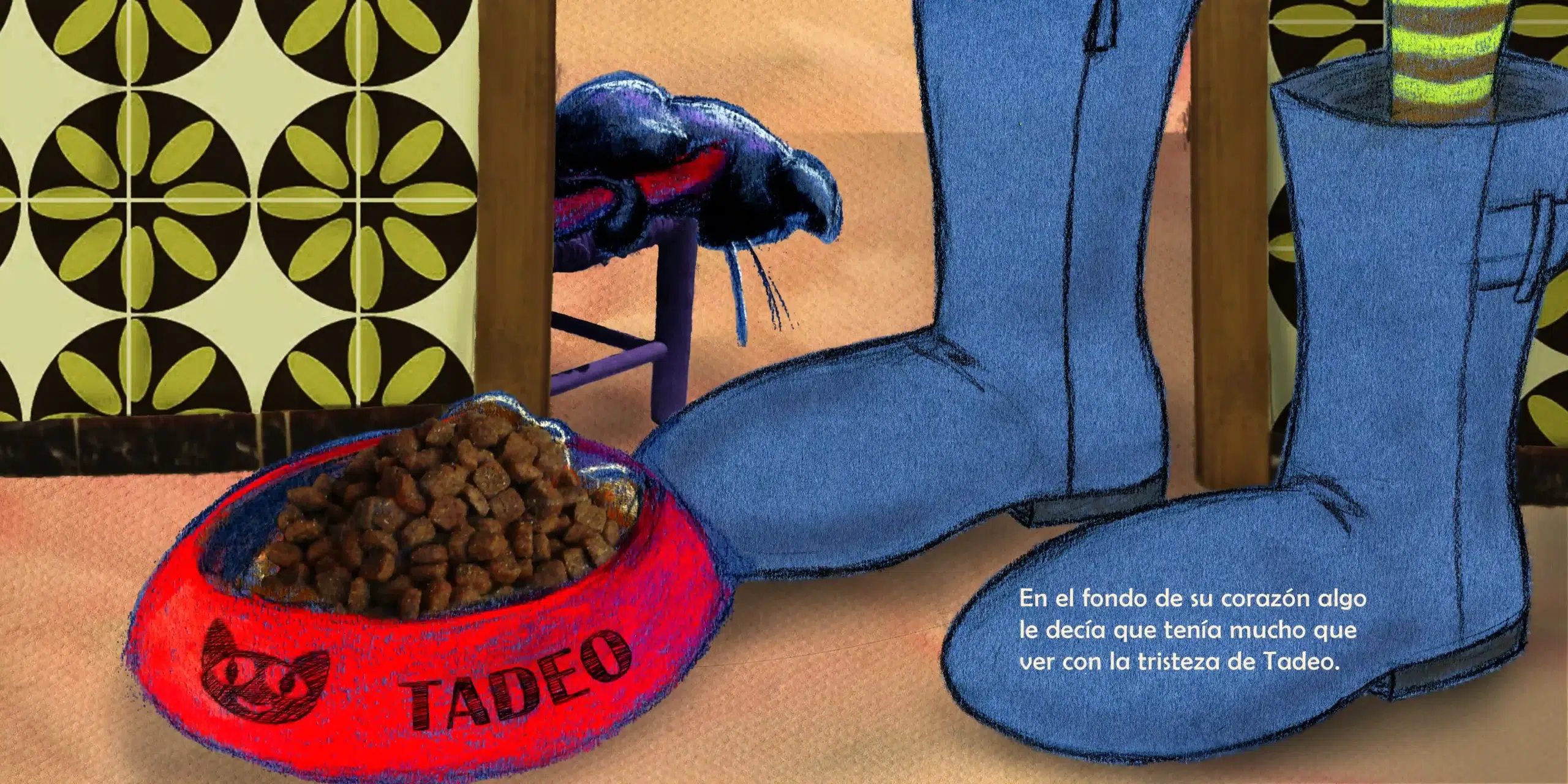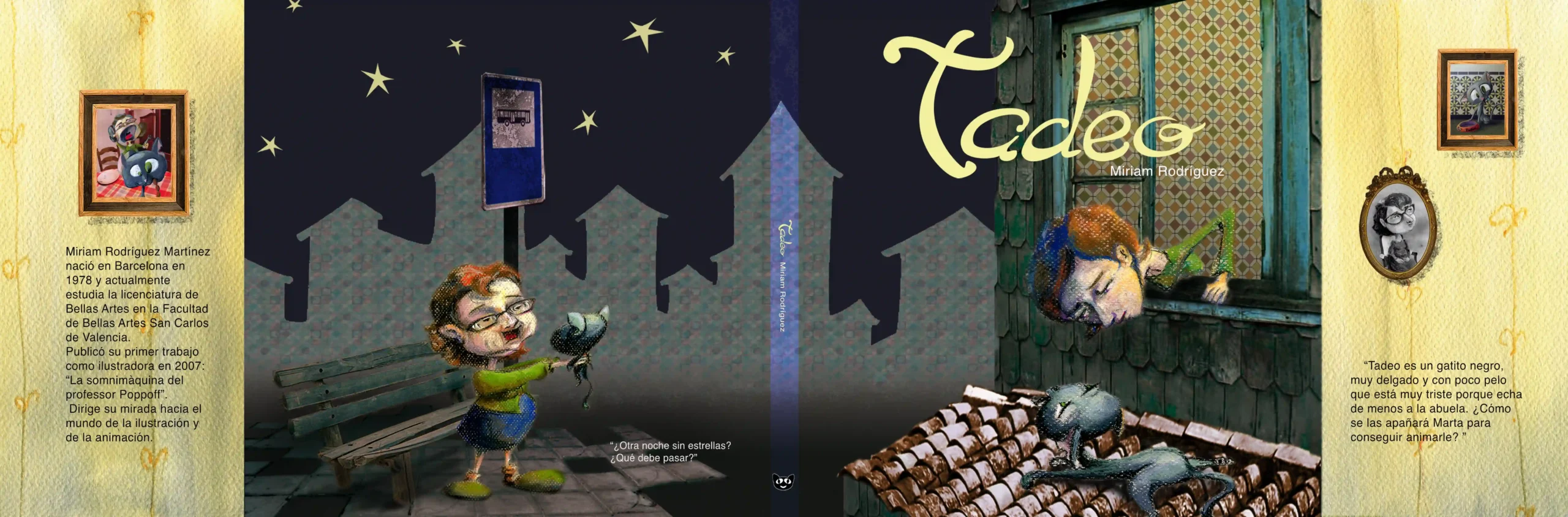 «Tadeo» was my first picture book; I made it while I was studying Fine Arts. It tells the story of a star cat who is sad about the loss of his owner and how his new owner encourages him to move on.